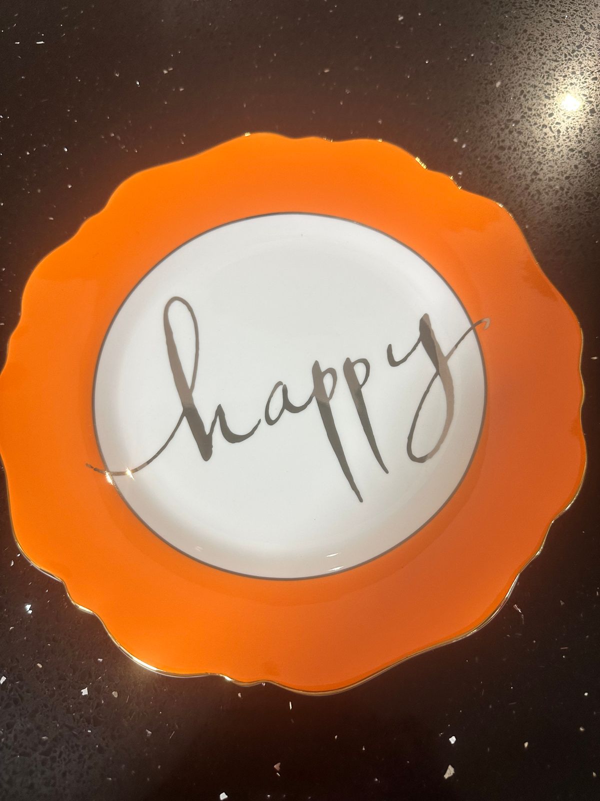 LyndalT 'Happy' Orange Side Plate Dimensions: 22.8cm | 9 inches. Hand-painted on new fine china.